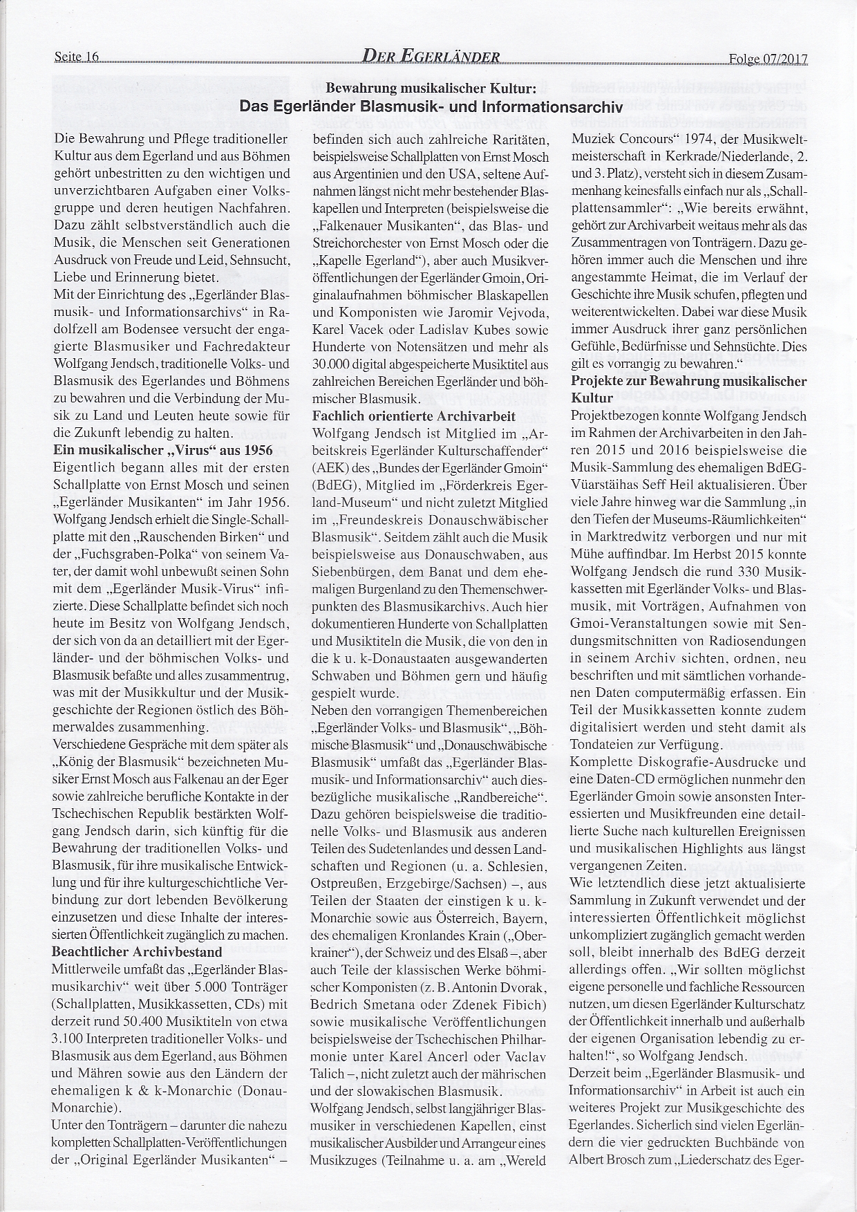 In ihrer Ausgabe Nr. 7, Juli 2017, veröffentlichte die Zeitschrift "Der Egerländer - Eghalanda Bundeszeitung" einen ausführlichen Beitrag über das "Egerländer Blasmusik- und Informationsarchiv" sowie über meine musikkulturelle Arbeit.