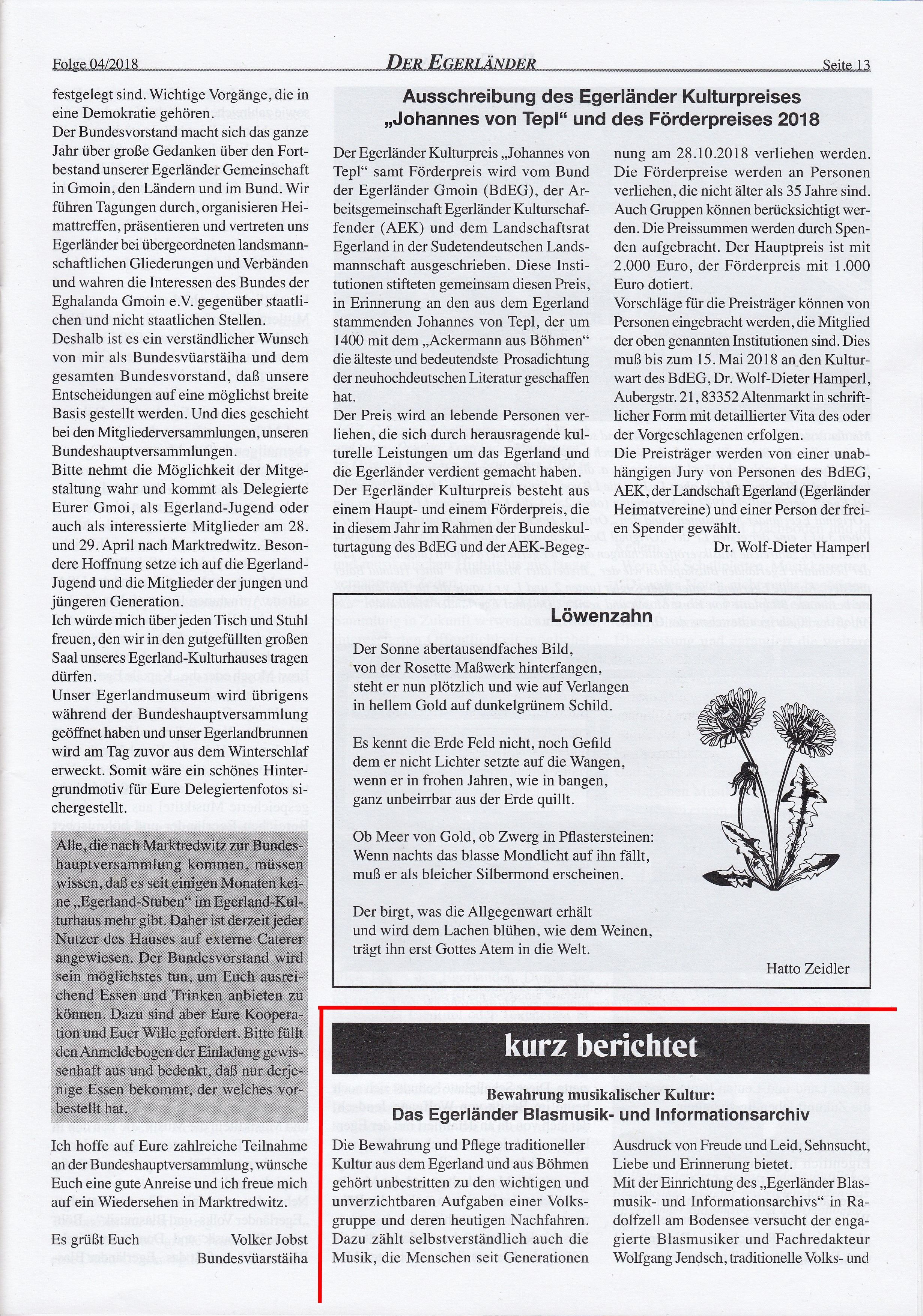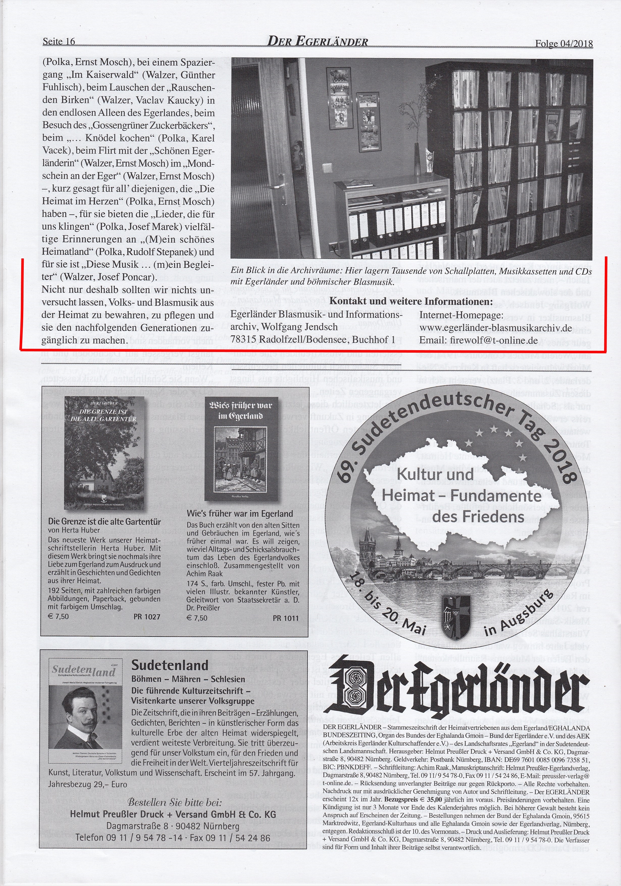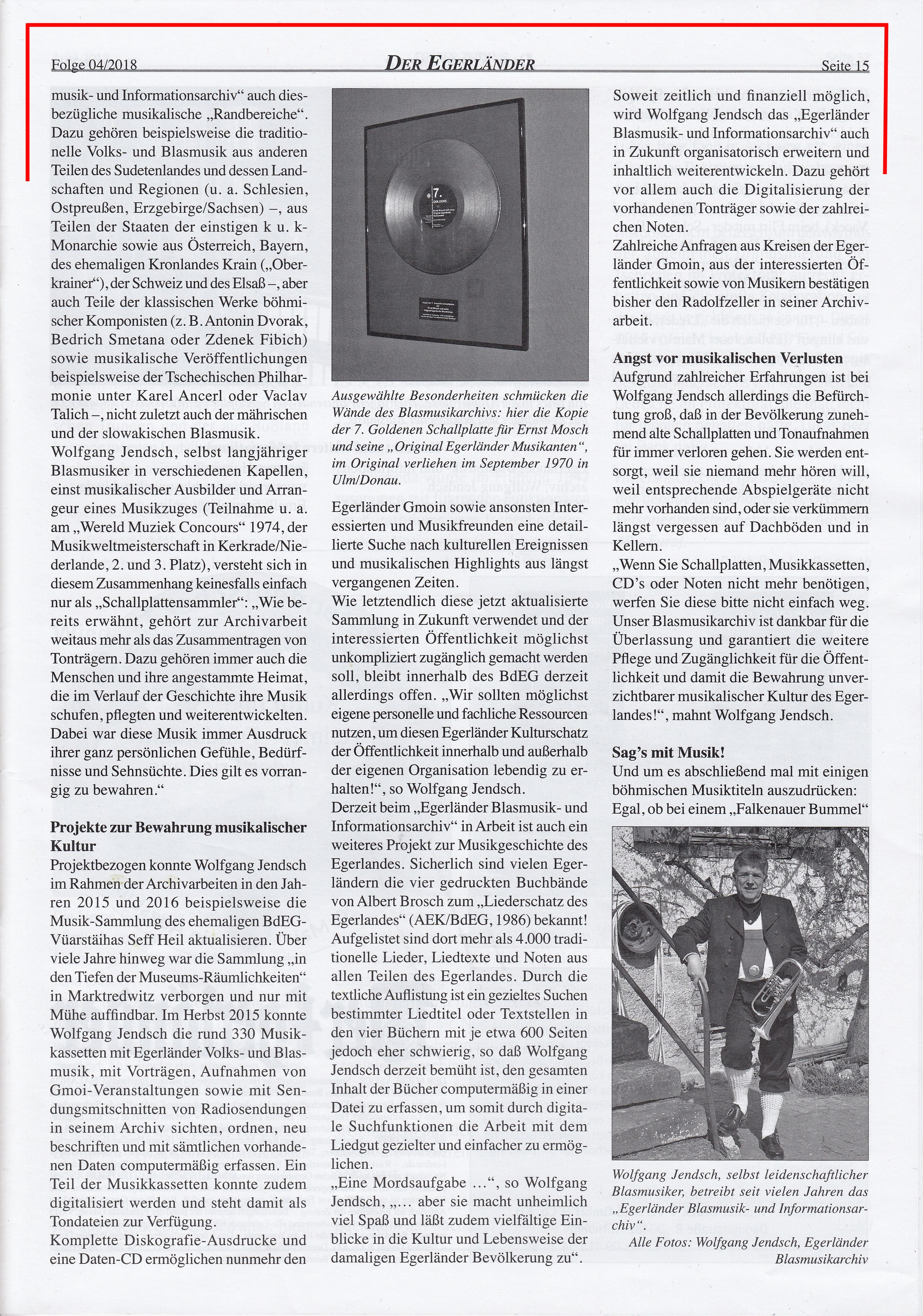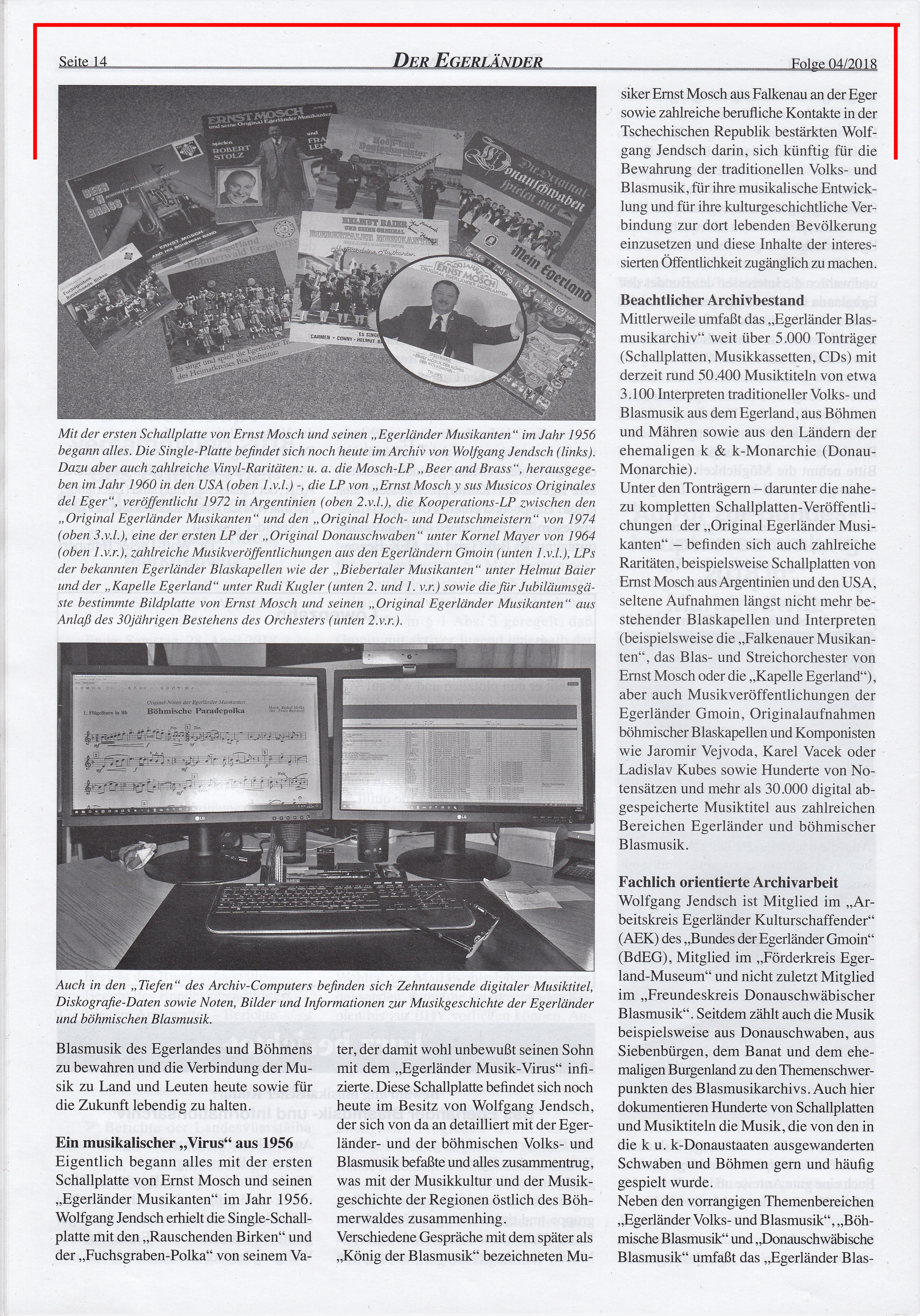 In ihrer Ausgabe Nr. 4, April 2018, veröffentlichte die Zeitschrift "Der Egerländer - Eghalanda Bundeszeitung" einen zweiten, erweiterten Beitrag über das "Egerländer Blasmusik- und Informationsarchiv" sowie über meine musikkulturelle Arbeit.